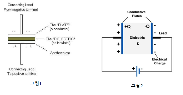 콘덴서는 일반적으로 두장의 전극판이 마주보는식의 구조로 이루어져있습니다. 아래의 두 그림으로 확인해보도록 하겠습니다
